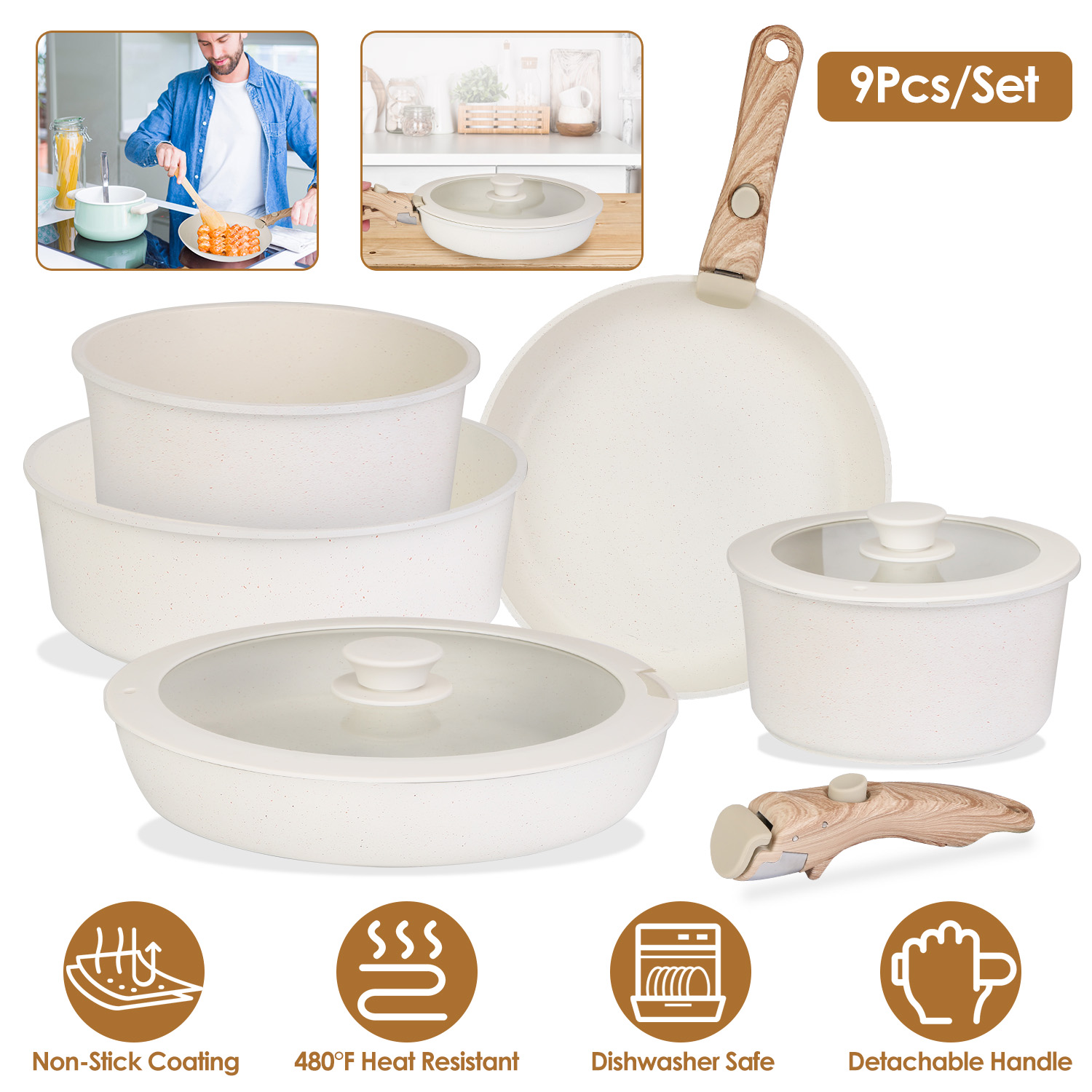 Home > 9Pcs Nonstick Cookware Set Kitchen Pots and Pans Set With Detachable Handles Tempered Glass Lids Dishwasher Oven Safe Aluminum Alloy Kitchen Cookware